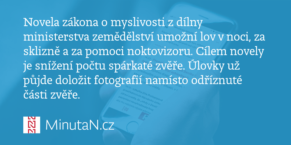 Pro myslivce novela mění 22 ustanovení... V předvánočním týdnu byl rozeslán k vyjádření návrh novely zákona o myslivosti z dílny ministerstva zemědělství, novely, která byla myslivcům ministrem zemědělství slíbena kromě jiného v … Ministr zemědělství poslal do vlády k projednání návrh novely zákona o myslivosti v době, kdy ještě ani nenabyla účinnosti jeho poslední novela schválená parlamentem a jejíž možný dopad nelze tedy objektivně vyhodnotit. Pro myslivce novela mění 22 ustanovení.. Vláda byla ministrem zemědělství ing.